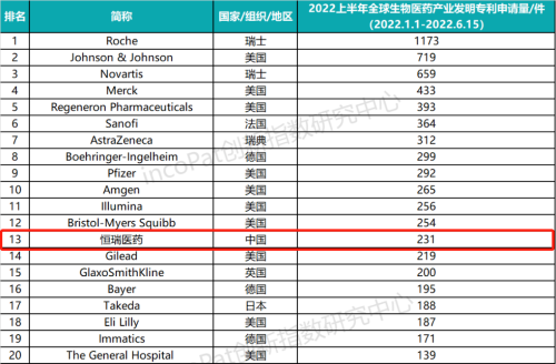 专利是药企最有价值的资产之一,是企业发展的基石,对做原创创新的企业尤为重要。全球专利数据库incoPat创新指数研究中心对2022年1月1日至2022年6月15日公开的全球生物医药产业发明专利申请数量进行统计排名,生物医药产业专利涉及生物技术药、基因工程药物、疫苗、诊断试剂、微生态制剂、血液制品等技术领域。入榜企业/医院主要来自13个国家、组织或地区,罗氏、强生、诺华分别位列前三,金年会金字招牌诚信至上医药(231件)排名第13位,领跑中国药企。