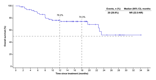 截至2024年12月20日,中位随访时间15.2个月,22例(32.8%)患者达到完全缓解,21例(31.3%)达到部分缓解,IRC评估的ORR为64.2%(95% CI,51.5-75.5)。在所有亚型中均观察到获益(ORR:AITL,70.3%[26/37];PTCL-NOS,57.1%[8/14];ENKTL-NT,50.0%[2/4];ALCL,ALK-,42.9%[3/7];ALCL,ALK+,50.0%[1/2];MEITL,100%[1/1];其他,100%[2/2])。在出现缓解的患者中,51.2%(22/43)的患者目前仍在缓解中,估计的中位DoR为18.7个月(95% CI,6.3-未达到[NR])。中位PFS为10.0个月(95% CI,3.7-15.7),中位OS尚未达到。安全性整体可控。